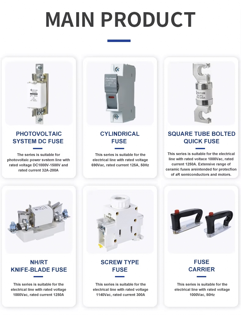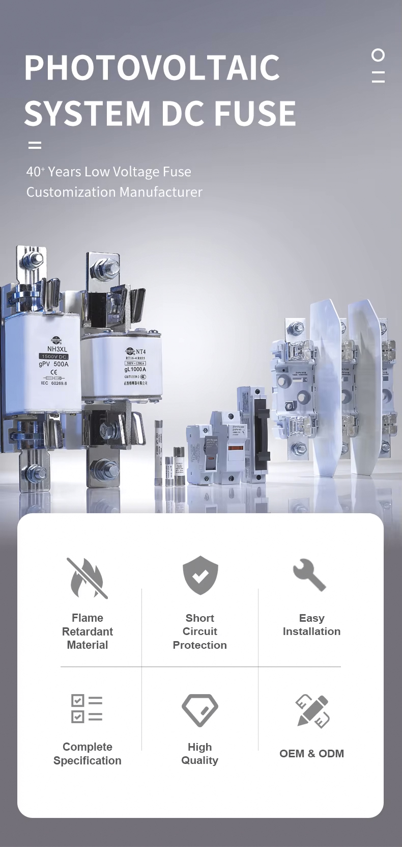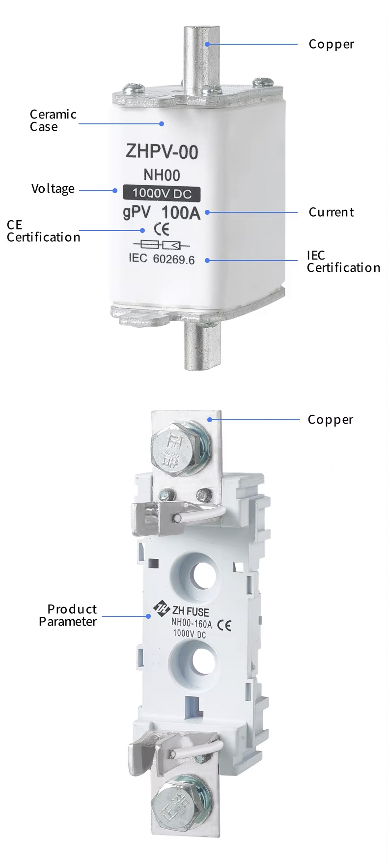 NH00 太陽光発電システム DC 1000V 32~100A ヒューズリンク 安定した信頼性の高いヒューズ特性、高速応答速度、高い安全性を確保するために、高品質の材料が選択されています。コンパクトな外観で設置が容易で、太陽光発電結合箱、インバータ、直流配電盤などのさまざまなシステムに広く使用されています。 NH00 太陽光発電システム DC 1000V 32 ~ 100A ヒューズ リンクは、複数の国際認証に合格し、IEC 規格に準拠しているため、発電所システムの安全な動作を確保するための理想的な選択肢となります。