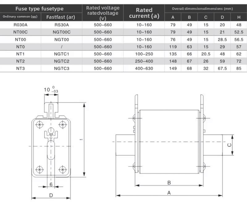 NT/NH ブレード タイプ ヒューズ リンク aM クラスは、モーター保護用です。これらの高遮断容量ヒューズ リンクは、モーター、変圧器、および突入電流の大きいその他の負荷の短絡保護を目的としています。上端には標準の視覚インジケータがあり、前面にはオプションのインジケータがあります。このシリーズのヒューズは、サイズ NH000 から NH4 までのヒューズで構成され、定格電流は最大 1250 A、定格電圧は最大 690 V です。